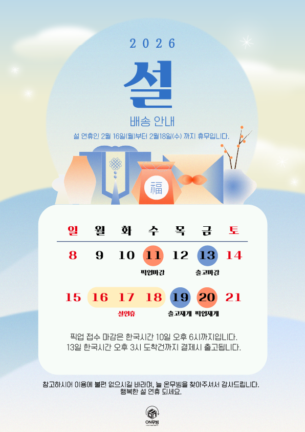 출고: 연휴 전 2월 13일(금)까지 출고 (한국시간 오후 3시 입고 까지)